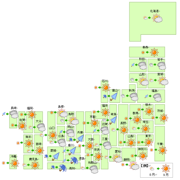 9月は「晴」が19から22地域に増加、「雨」は4から2地域に減少した。「曇」は5から11地域に増加、