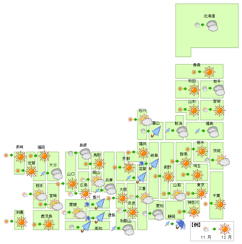 12月は「晴」が23地域で変わらず、「雨」は3から1地域に減少した。「曇」は7から9地域に増加、