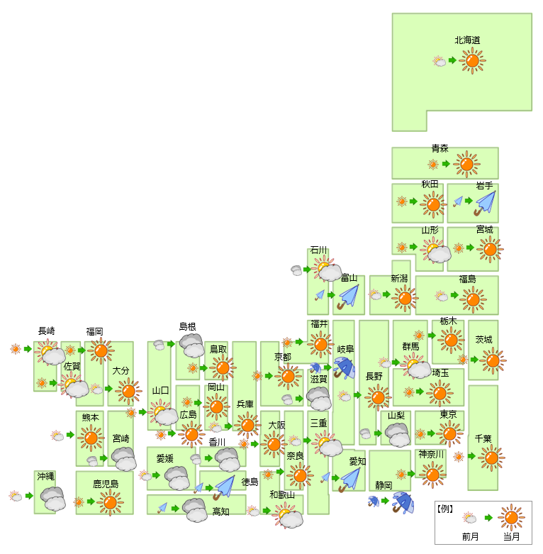 全国で天候が改善した地域数は10→9地域に減少、横ばいは28→32地域に増加、