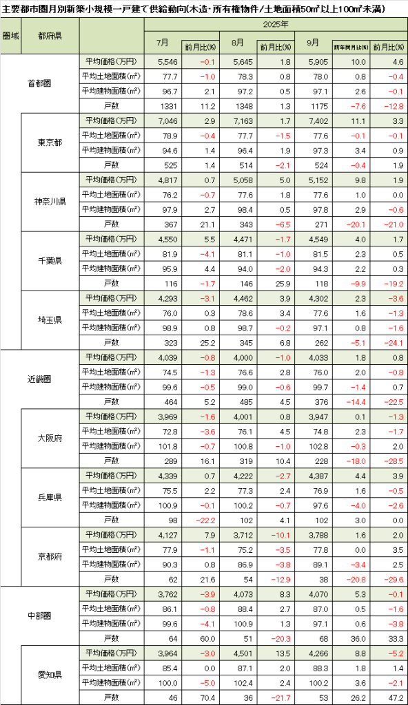 9月の首都圏新築小規模一戸建て住宅の平均価格は、前月比+4.6%の5,905万円と引き続き上昇した。都県別では東京都が+3.3%の7,402万円、神奈川県が+1.9%の5,152万円と3ヵ月連続の上昇。千葉県は+1.7%の4,549万円と上昇した。埼玉県は-3.6%の4,302万円と再び下落。東京都の上昇と戸数シェア拡大により、首都圏の上昇率が拡大したと考えられる。東京都は前年同月比で2ケタ上昇。