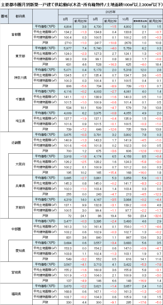 10月の首都圏新築一戸建て住宅の平均価格は前月比+1.5%の4,802万円と上昇した。都県別では、東京都が+0.3%の5,759万円と上昇。戸数シェアの大きい都下での上昇が影響した。神奈川県は+2.8%の5,318万円で3ヵ月連続の上昇となった。千葉県は+1.4%の4,061万円と4ヵ月ぶりに上昇。埼玉県は+2.0%の4,055万円と上昇し、再び4,000万円台に載せた。10月は全都県で上昇。前年同月比は引き続きプラスの水準で推移している。