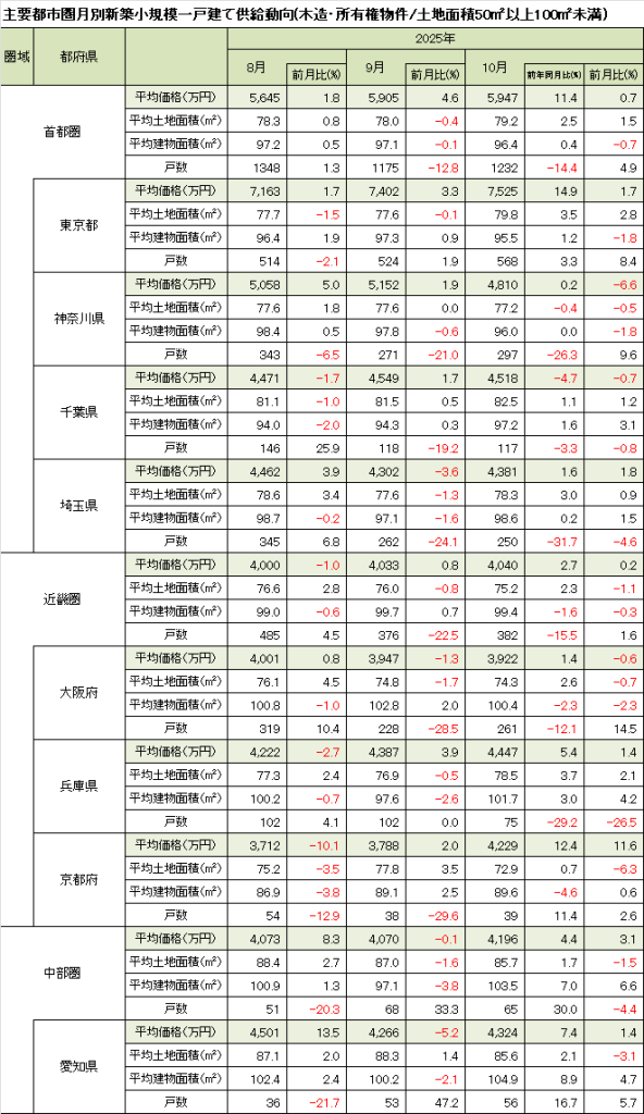 10月の首都圏新築小規模一戸建て住宅の平均価格は前月比+0.7%の5,947万円と3ヵ月連続で上昇した。都県別では東京都が+1.7%の7,525万円と4ヵ月連続の上昇。神奈川県は-6.6%の4,810万円と4ヵ月ぶりに下落した。千葉県は-0.7%の4,518万円と下落し、前年同月比もマイナスに振れた。埼玉県は+1.8%の4,381万円と上昇。神奈川県が比較的大きく下落したことで首都圏全体では上昇率が縮小したが、前年同月比は引き続き2ケタ上昇している。