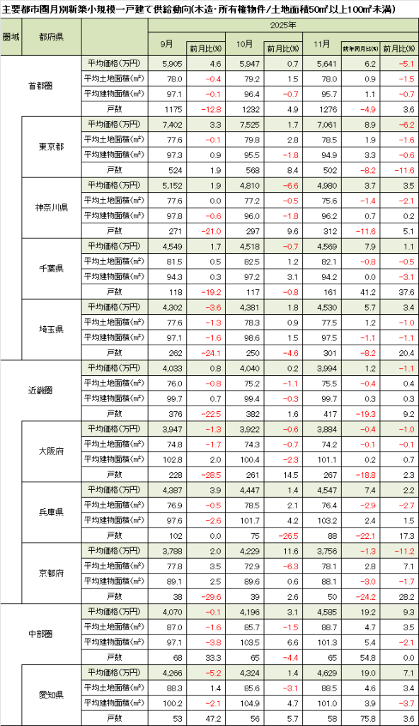 11月の首都圏新築小規模一戸建て住宅の平均価格は前月比-5.1%の5,641万円と4ヵ月ぶりに下落した。都県別では東京都が-6.2%の7,061万円と5ヵ月ぶりの下落。神奈川県は+3.5%の4,980万円と上昇した。千葉県は+1.1%の4,569万円で、前年同月を上回った。埼玉県は+3.4%の4,530万円と連続の上昇。東京都の価格下落と、戸数シェアの変動が、首都圏の前月比下落の要因となったと考えられる。