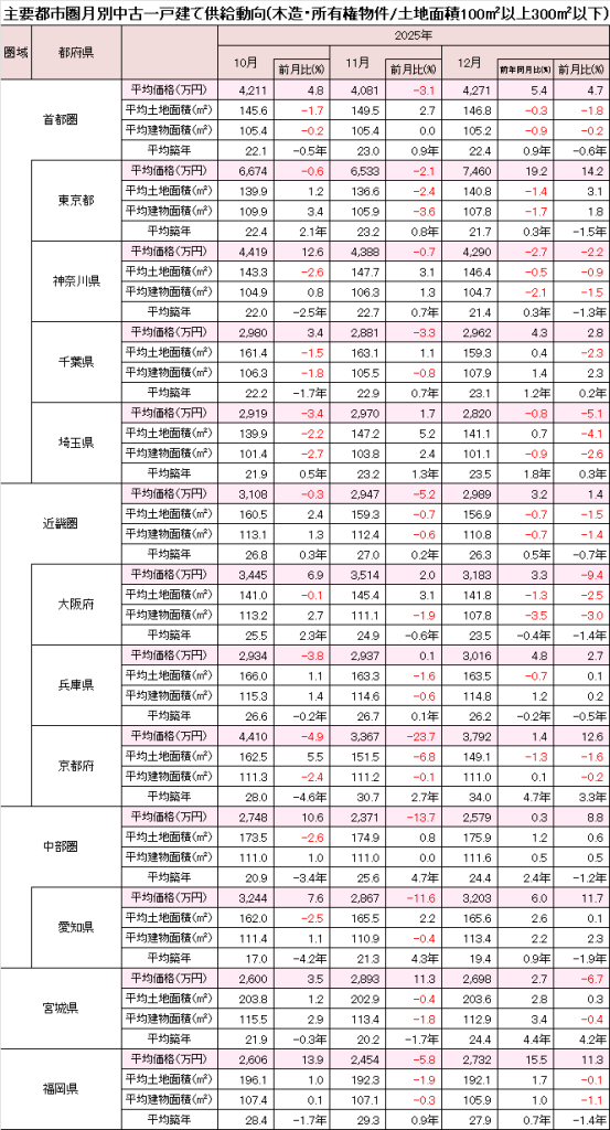12月の首都圏中古一戸建て住宅価格は、前月比+4.7%の4,271万円と上昇した。東京都は+14.2%の7,460万円と3ヵ月ぶりの上昇。築年数が1年以上若返り、上昇率は前年同月比含め2ケタに達している。神奈川県は-2.2%の4,290万円と下落が続き、前年同月も下回った。千葉県は+2.8%の2,962万円と上昇。前年同月比も、築古化の一方で価格が上回っている。埼玉県は-5.1%の2,820万円と下落した。