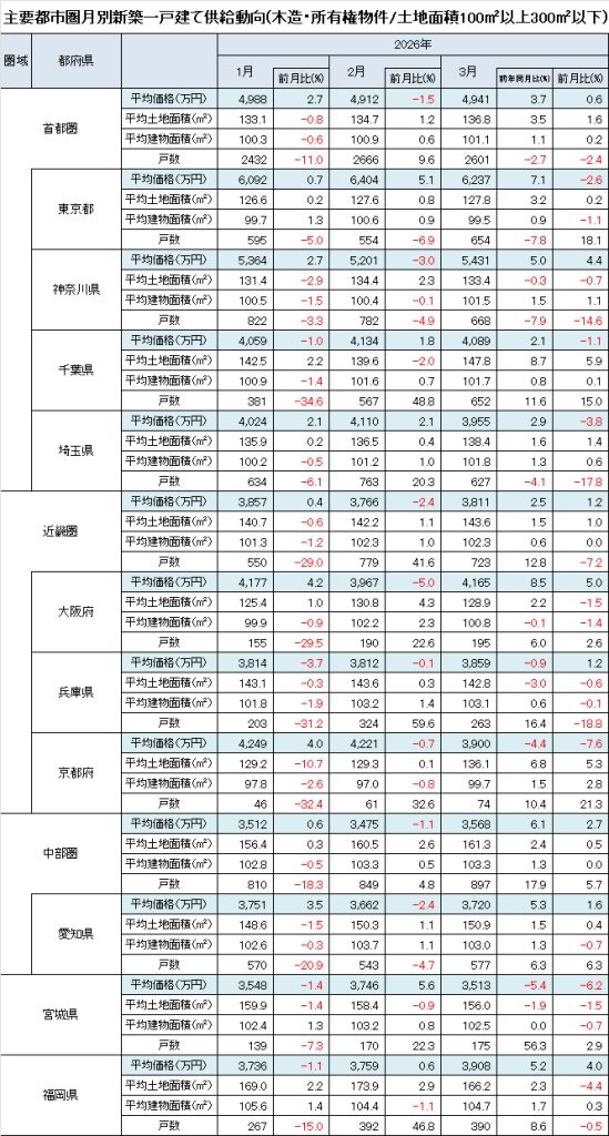 3月の首都圏新築一戸建て住宅の平均価格は前月比+0.6%の4,941万円と上昇した。都県別では東京都が-2.6%の6,237万円と6ヵ月ぶりに下落へ転じた。東京23区の下落に加え、都下の戸数シェア拡大が要因とみられる。神奈川県は+4.4%の5,431万円と上昇し、今年1月の価格も上回った。千葉県は-1.1%の4,089万円と下落。埼玉県は-3.8%の3,955万円と4ヵ月ぶりに下落し、4,000万円も下回った。千葉県と埼玉県はともに、前年同月比ではプラスを維持している。
