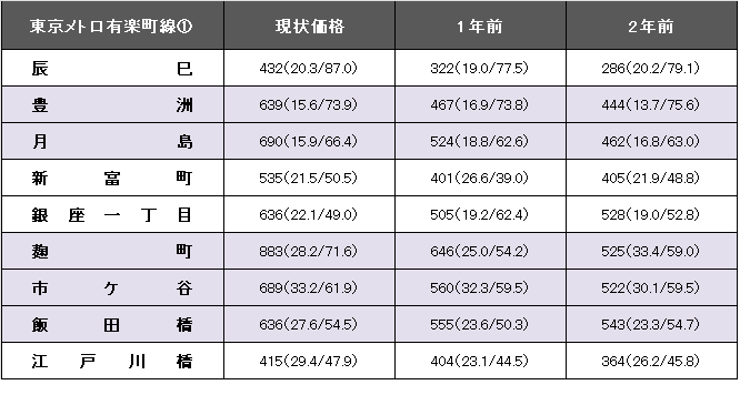 東京メトロ有楽町線(辰巳~和光市)の平均坪単価は508万円で1年前に比べて113万円、28.6%上昇した。事例数は4090件(前年より87件減)、平均築年数が24.2年(1年前25.0年)、平均専有面積は61.35平方メートル(同57.10平方メートル)。今回掲載区間(辰巳~江戸川橋)の最高値は麹町の883万円。