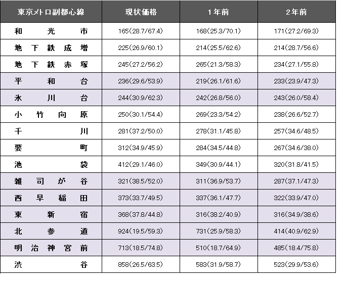 東京メトロ副都心線(和光市~渋谷)の平均坪単価は465万円で1年前に比べて96万円、26.0%上昇した。事例数は2415件(前年より506件減)、平均築年数が29.5年(1年前30.6年)、平均専有面積は54.66平方メートル(同53.05平方メートル)。同路線の最高値は北参道の924万円。