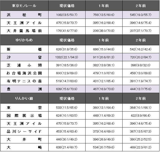 東京モノレール羽田線(浜松町~羽田空港第2ターミナル)の平均坪単価は785万円で、1年前に比べて239万円上昇した。事例数が300件(前年より22件減)、平均築年数が15.2年(1年前17.9年)、平均専有面積は60.91平方メートル(同64.91平方メートル)。浜松町は前期の38%台を上回る43%台の大幅上昇。築浅化が進み、1000万円の大台に乗った。