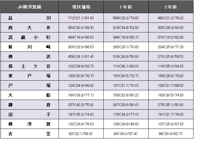 JR横須賀線(東京~久里浜)における平均坪単価は305万円で1年前に比べて69万円、29.1%上昇した。事例数は4796件(前年より455件増)、平均築年数が29.3年(1年前も同じ)、平均専有面積は69.75平方メートル(同68.70平方メートル)。同路線の最高値は品川の712万円。