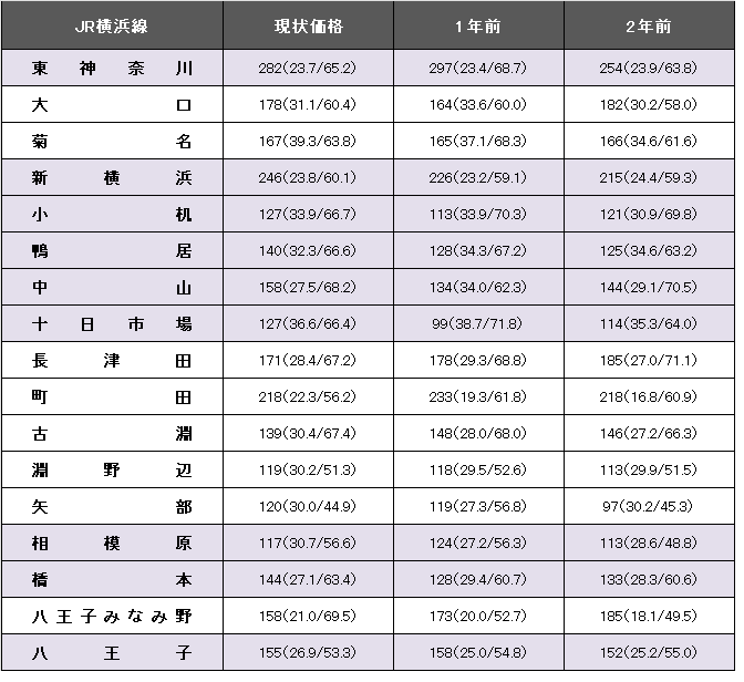 JR横浜線(東神奈川~八王子)における平均坪単価は158万円で、1年前に比べて1万円、1.0%上昇した。事例数は3660件(前年より188件減)、平均築年数が29.3年(1年前28.7年)、平均専有面積は60.35平方メートル(同61.08平方メートル)。掲載区間における最高値は東神奈川の282万円。