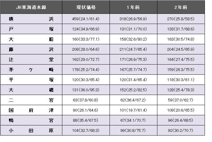 JR東海道本線(横浜~小田原)の平均坪単価は207万円で、1年前に比べて17.1%、30万円上昇した。事例数が4509件(前年より11件増)、平均築年数が29.2年(1年前は28.5年)、平均専有面積は68.05平方メートル(同69.19平方メートル)。同路線の最高値は横浜の459万円。