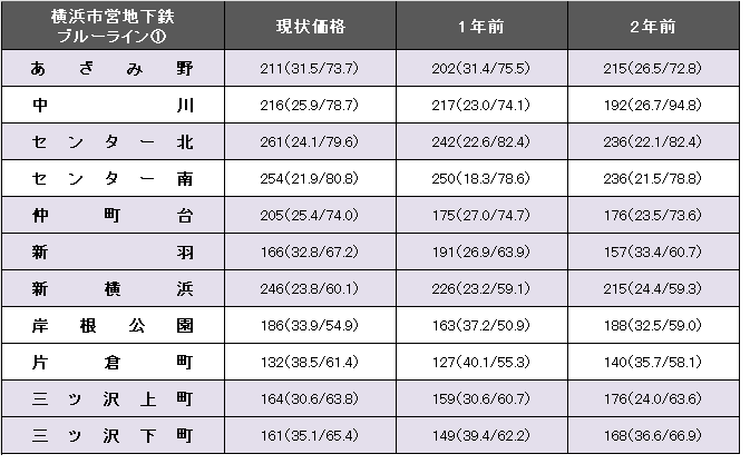 横浜市営地下鉄ブルーライン(あざみ野~湘南台)における平均坪単価は231万円で1年前に比べて33万円、16.4%上昇した。事例数は5329件(前年より75件減)、平均築年数が29.7年(1年前は29.4年)、平均専有面積は61.16平方メートル(同60.52平方メートル)。今回掲載区間(あざみ野~三ツ沢下町)における最高値はセンター北の261万円。