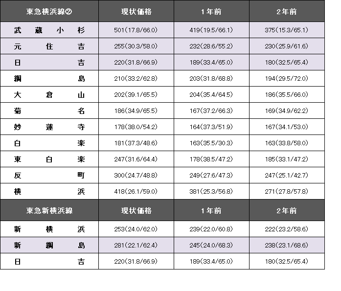 東急新横浜線(新横浜~日吉)の平均坪単価は235万円で、1年前に比べて23万円上昇した。事例数は714件(前年より69件減)、平均築年数は28.7年(1年前28.5年)、平均専有面積は65.08平方メートル(同64.05平方メートル)。最高値は14%台の大幅上昇で281万円となった新綱島。事例の若返りで、平均築年数は22.1年となった。